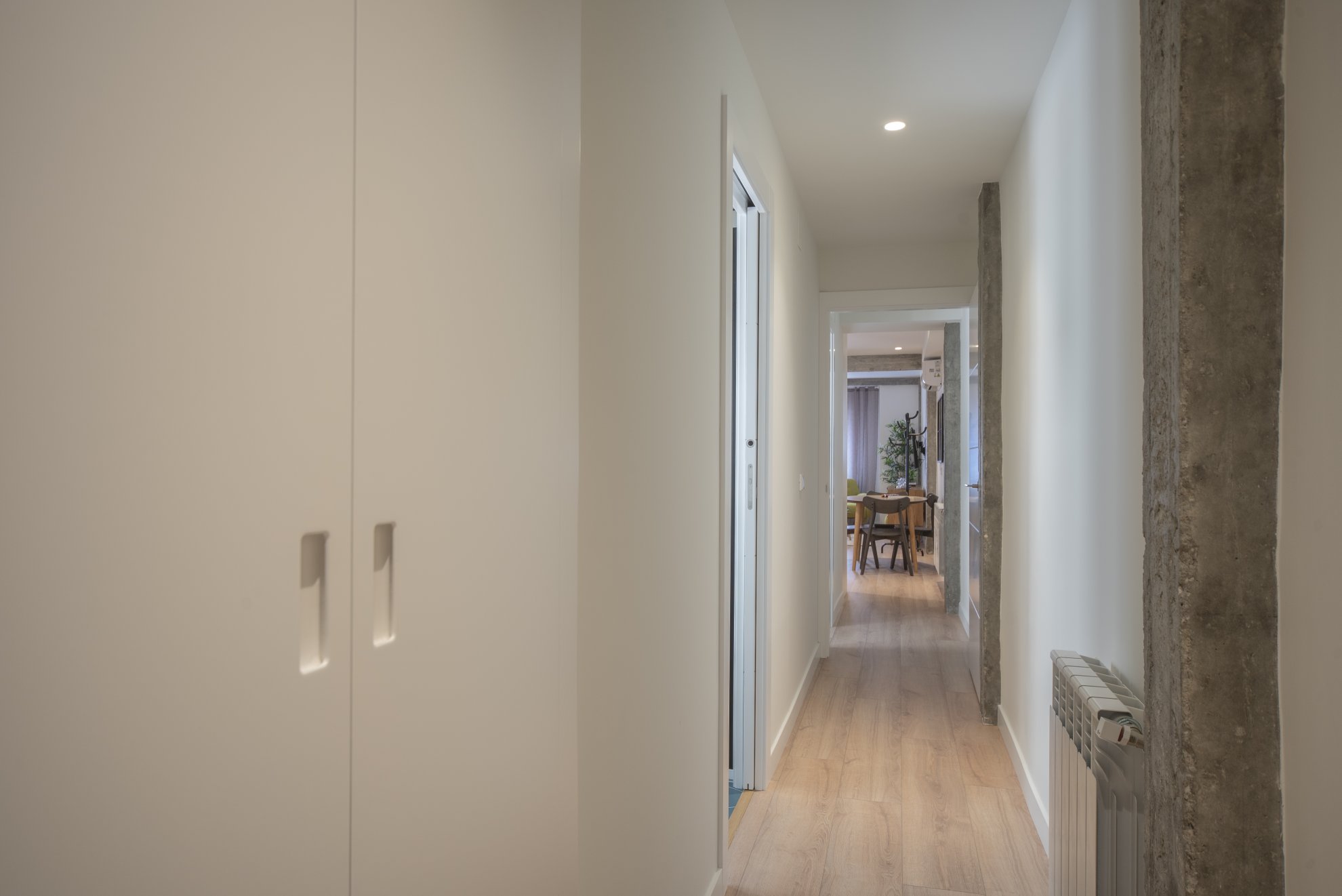 Se eliminó el tabique de separación de la cocina de manera que el espacio quedase más amplio y se ganaba esa superficie de pasillo para incorporarla al salón-comedor.